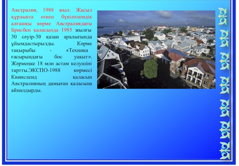 Слайд 16Австралия, 1988 жыл. Жасыл құрлықта өткен бүкіләлемдік алғашқы көрме Австралиядағы Брисбен