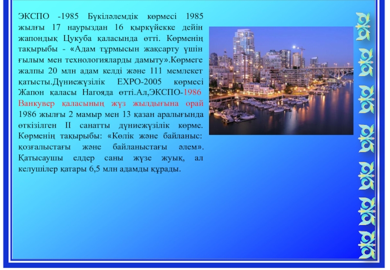 Слайд 15ЭКСПО -1985 Бүкіләлемдік көрмесі 1985 жылғы 17 наурыздан 16 қыркүйекке дейін