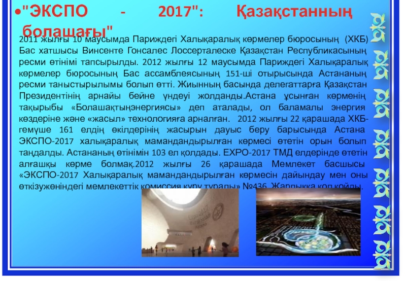 бюросының (ХКБ) Бас хатшысы Винсенте Гонсалес Лоссерталеске Қазақстан Республикасының ресми өтінімі тапсырылды. 2012 жылғы 12 маусымда Париждегі Халықаралық көрмелер бюросының Бас ассамблеясының 151-ші отырысында Астананың ресми таныстырылымы болып өтті. Жиынның басында делегаттарға Қазақстан Президентінің арнайы бейне үндеуі жолданды.Астана ұсынған көрменің тақырыбы «Болашақтыңэнергиясы» деп аталады, ол баламалы энергия көздеріне және «жасыл» технологияға арналған. 2012 жылғы 22 қарашада ХКБ-гемүше 161 елдің өкілдерінің жасырын дауыс беру барысында Астана ЭКСПО-2017 халықаралық мамандандырылған көрмесі өтетін орын болып таңдалды. Астананың өтінімін 103 ел қолдады. ЕХРО-2017 ТМД елдерінде өтетін алғашқы көрме болмақ.2012 жылғы 26 қарашада Мемлекет басшысы «ЭКСПО-2017 Халықаралық мамандандырылған көрмесін дайындау мен оны өткізужөніндегі мемлекеттік комиссия құру туралы» №436 Жарлыққа қол қойды.