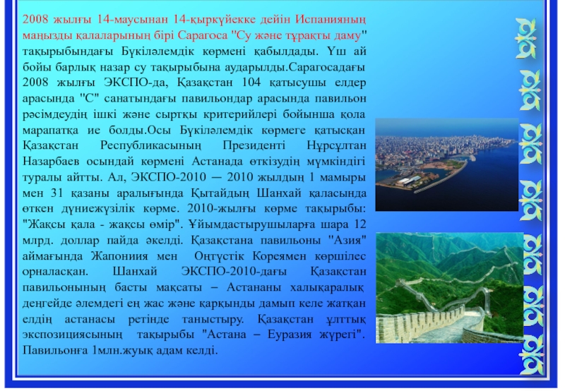 және тұрақты даму" тақырыбындағы Бүкіләлемдік көрмені қабылдады. Үш ай бойы барлық назар су тақырыбына аударылды.Сарагосадағы 2008 жылғы ЭКСПO-да, Қазақстан 104 қатысушы елдер арасында "С" санатындағы павильондар арасында павильон рәсімдеудің ішкі және сыртқы критерийлері бойынша қола марапатқа ие болды.Осы Бүкіләлемдік көрмеге қатысқан Қазақстан Республикасының Президенті Нұрсұлтан Назарбаев осындай көрмені Астанада өткізудің мүмкіндігі туралы айтты. Ал, ЭКСПО-2010 — 2010 жылдың 1 мамыры мен 31 қазаны аралығында Қытайдың Шанхай қаласында өткен дүниежүзілік көрме. 2010-жылғы көрме тақырыбы: "Жақсы қала - жақсы өмір". Ұйымдастырушыларға шара 12 млрд. доллар пайда әкелді. Қазақстана павильоны "Азия" аймағында Жапониия мен Оңтүстік Кореямен көршілес орналасқан. Шанхай ЭКСПО-2010-дағы Қазақстан павильонының басты мақсаты – Астананы халықаралық деңгейде әлемдегі ең жас және қарқынды дамып келе жатқан елдің астанасы ретінде таныстыру. Қазақстан ұлттық экспозициясының тақырыбы "Астана – Еуразия жүрегі". Павильонға 1млн.жуық адам келді.