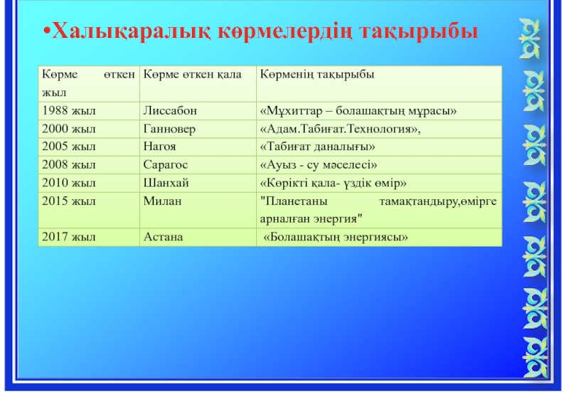 Слайд 20Халықаралық көрмелердің тақырыбы