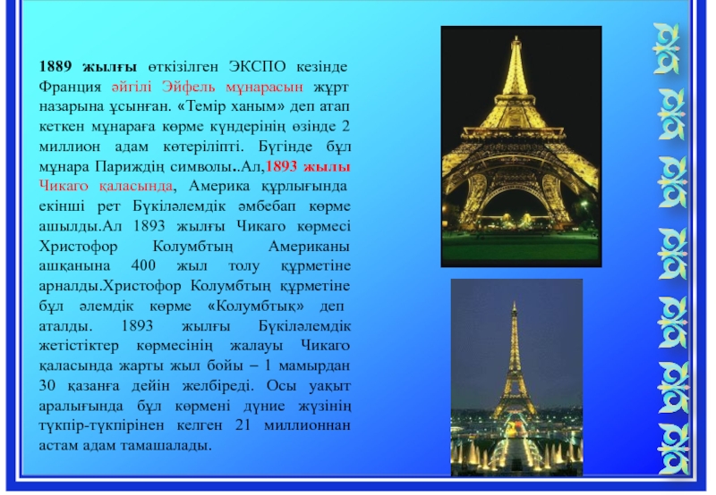ұсынған. «Темір ханым» деп атап кеткен мұнараға көрме күндерінің өзінде 2 миллион адам көтеріліпті. Бүгінде бұл мұнара Париждің символы..Ал,1893 жылы Чикаго қаласында, Америка құрлығында екінші рет Бүкіләлемдік әмбебап көрме ашылды.Ал 1893 жылғы Чикаго көрмесі Христофор Колумбтың Американы ашқанына 400 жыл толу құрметіне арналды.Христофор Колумбтың құрметіне бұл әлемдік көрме «Колумбтық» деп аталды. 1893 жылғы Бүкіләлемдік жетістіктер көрмесінің жалауы Чикаго қаласында жарты жыл бойы – 1 мамырдан 30 қазанға дейін желбіреді. Осы уақыт аралығында бұл көрмені дүние жүзінің түкпір-түкпірінен келген 21 миллионнан астам адам тамашалады.