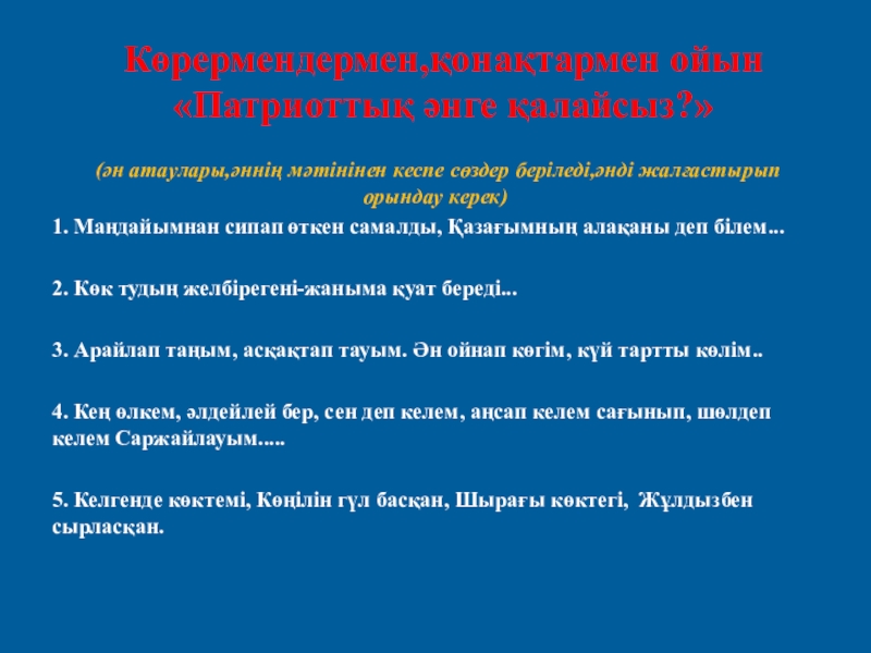 Слайд 12Көрермендермен,қонақтармен ойын «Патриоттық әнге қалайсыз?»