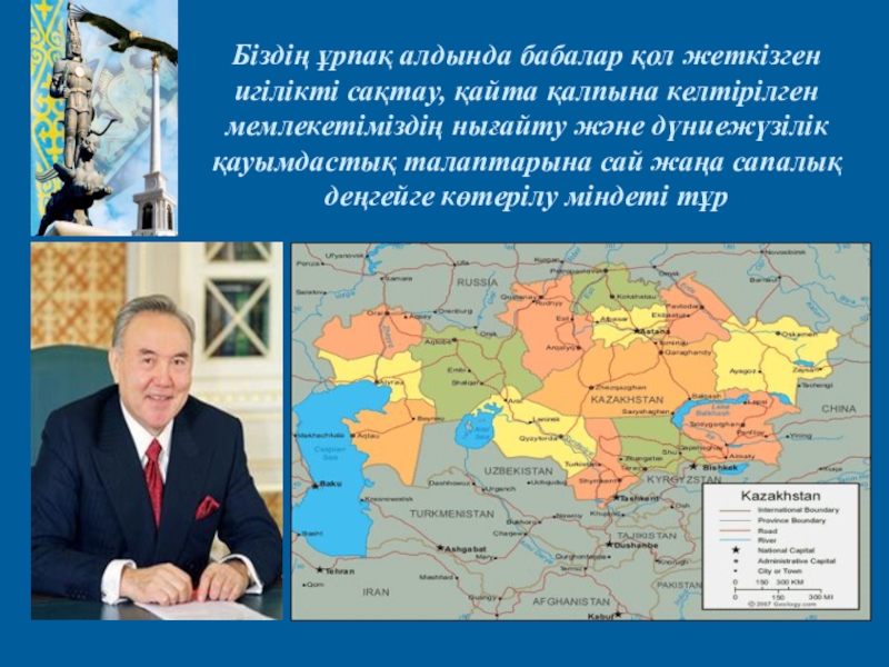 мемлекетіміздің нығайту және дүниежүзілік қауымдастық талаптарына сай жаңа сапалық деңгейге көтерілу міндеті тұр