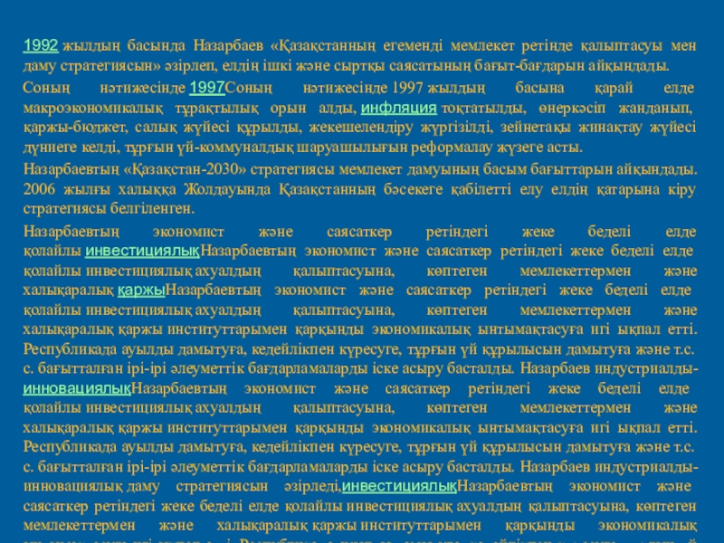 Назарбаевтың экономист және саясаткер ретіндегі жеке беделі елде қолайлы инвестициялықНазарбаевтың экономист және саясаткер ретіндегі жеке беделі елде қолайлы инвестициялық ахуалдың қалыптасуына, көптеген мемлекеттермен және халықаралық қаржыНазарбаевтың экономист және саясаткер ретіндегі жеке беделі елде қолайлы инвестициялық ахуалдың қалыптасуына, көптеген мемлекеттермен және халықаралық қаржы институттарымен қарқынды экономикалық ынтымақтасуға игі ықпал етті. Республикада ауылды дамытуға, кедейлікпен күресуге, тұрғын үй құрылысын дамытуға және т.с.с. бағытталған ірі-ірі әлеуметтік бағдарламаларды іске асыру басталды. Назарбаев индустриалды-инновациялықНазарбаевтың экономист және саясаткер ретіндегі жеке беделі елде қолайлы инвестициялық ахуалдың қалыптасуына, көптеген мемлекеттермен және халықаралық қаржы институттарымен қарқынды экономикалық ынтымақтасуға игі ықпал етті. Республикада ауылды дамытуға, кедейлікпен күресуге, тұрғын үй құрылысын дамытуға және т.с.с. бағытталған ірі-ірі әлеуметтік бағдарламаларды іске асыру басталды. Назарбаев индустриалды-инновациялық даму стратегиясын әзірледі,инвестициялықНазарбаевтың экономист және саясаткер ретіндегі жеке беделі елде қолайлы инвестициялық ахуалдың қалыптасуына, көптеген мемлекеттермен және халықаралық қаржы институттарымен қарқынды экономикалық ынтымақтасуға игі ықпал етті. Республикада ауылды дамытуға, кедейлікпен күресуге, тұрғын үй құрылысын дамытуға және т.с.с. бағытталған ірі-ірі әлеуметтік бағдарламаларды іске асыру басталды. Назарбаев индустриалды-инновациялық даму стратегиясын әзірледі,инвестициялық және инновациялық қорлар құрылды. Дүниежүзілік сарапшыларарасында «қазақстандық үлгі» термині пайда болды. Қысқа мерзім ішінде халықаралық ынтымақтастық тұжырымдамасын қалыптастырды. Оның көптеген бастамалары кең халықаралық жаңғырық тапты әрі мойындалды. Мәселен, Семей ядролық полигонын жабу, ядролық держава мәртебесінен бас тарту, жаһандық және өңірлік қауіпсіздікті қамтамасыз ету жөніндегі дәйекті қызмет, т.б. Назарбаев ТМДНазарбаевтың экономист және саясаткер ретіндегі жеке беделі елде қолайлы инвестициялық ахуалдың қалыптасуына, көптеген мемлекеттермен және халықаралық қаржы институттарымен қарқынды экономикалық ынтымақтасуға игі ықпал етті. Республикада ауылды дамытуға, кедейлікпен күресуге, тұрғын үй құрылысын дамытуға және т.с.с. бағытталған ірі-ірі әлеуметтік бағдарламаларды іске асыру басталды. Назарбаев индустриалды-инновациялық даму стратегиясын әзірледі,инвестициялық және инновациялық қорлар құрылды. Дүниежүзілік сарапшыларарасында «қазақстандық үлгі» термині пайда болды. Қысқа мерзім ішінде халықаралық ынтымақтастық тұжырымдамасын қалыптастырды. Оның көптеген бастамалары кең халықаралық жаңғырық тапты әрі мойындалды. Мәселен, Семей ядролық полигонын жабу, ядролық держава мәртебесінен бас тарту, жаһандық және өңірлік қауіпсіздікті қамтамасыз ету жөніндегі дәйекті қызмет, т.б. Назарбаев ТМД, ОАО, Кеден одағыНазарбаевтың экономист және саясаткер ретіндегі жеке беделі елде қолайлы инвестициялық ахуалдың қалыптасуына, көптеген мемлекеттермен және халықаралық қаржы институттарымен қарқынды экономикалық ынтымақтасуға игі ықпал етті. Республикада ауылды дамытуға, кедейлікпен күресу