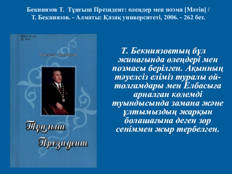 Слайд 34Бекниязов Т. Тұңғыш Президент: өлеңдер мен поэма [Мәтін] /