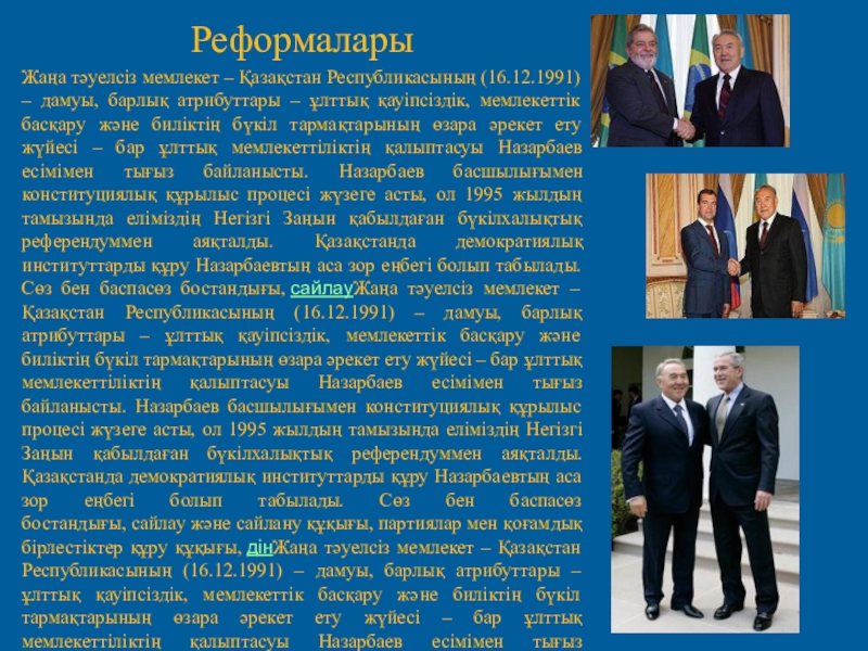 – ұлттық қауіпсіздік, мемлекеттік басқару және биліктің бүкіл тармақтарының өзара әрекет ету жүйесі – бар ұлттық мемлекеттіліктің қалыптасуы Назарбаев есімімен тығыз байланысты. Назарбаев басшылығымен конституциялық құрылыс процесі жүзеге асты, ол 1995 жылдың тамызында еліміздің Негізгі Заңын қабылдаған бүкілхалықтық референдуммен аяқталды. Қазақстанда демократиялық институттарды құру Назарбаевтың аса зор еңбегі болып табылады. Сөз бен баспасөз бостандығы, сайлауЖаңа тәуелсіз мемлекет – Қазақстан Республикасының (16.12.1991) – дамуы, барлық атрибуттары – ұлттық қауіпсіздік, мемлекеттік басқару және биліктің бүкіл тармақтарының өзара әрекет ету жүйесі – бар ұлттық мемлекеттіліктің қалыптасуы Назарбаев есімімен тығыз байланысты. Назарбаев басшылығымен конституциялық құрылыс процесі жүзеге асты, ол 1995 жылдың тамызында еліміздің Негізгі Заңын қабылдаған бүкілхалықтық референдуммен аяқталды. Қазақстанда демократиялық институттарды құру Назарбаевтың аса зор еңбегі болып табылады. Сөз бен баспасөз бостандығы, сайлау және сайлану құқығы, партиялар мен қоғамдық бірлестіктер құру құқығы, дінЖаңа тәуелсіз мемлекет – Қазақстан Республикасының (16.12.1991) – дамуы, барлық атрибуттары – ұлттық қауіпсіздік, мемлекеттік басқару және биліктің бүкіл тармақтарының өзара әрекет ету жүйесі – бар ұлттық мемлекеттіліктің қалыптасуы Назарбаев есімімен тығыз байланысты. Назарбаев басшылығымен конституциялық құрылыс процесі жүзеге асты, ол 1995 жылдың тамызында еліміздің Негізгі Заңын қабылдаған бүкілхалықтық референдуммен аяқталды. Қазақстанда демократиялық институттарды құру Назарбаевтың аса зор еңбегі болып табылады. Сөз бен баспасөз бостандығы, сайлау және сайлану құқығы, партиялар мен қоғамдық бірлестіктер құру құқығы, дін бостандығы сияқты азаматтық қоғамның мызғымас құндылықтары нақ соның тұсында ғана конституциялық нормаларға айналды. Назарбаев басшылығымен кеңестік өкімшіл-жоспарлы әкімшілік жүйе бұзылғаннан және бірегей халық шаруашылық кешені күйрегеннен кейін алапат дағдарысқа тап болған қазақстандық экономиканы өзгертуге бағытталған аса ауқымды шаралар әзірленіп, іске асырылды. Экономикалық саясатты жәнедемократиялық өзгерістерді ойдағыдай жүзеге асыруға мемлекеттік құрылымның президенттік республика ретіндегі халық таңдаған үлгісі көп септігін тигізді. Түбегейлі экономикалық ырықтандыру мен саяси реформалар белгіленген өзгертулерді пәрменді жүргізуге асыруға көмектесті.[3]