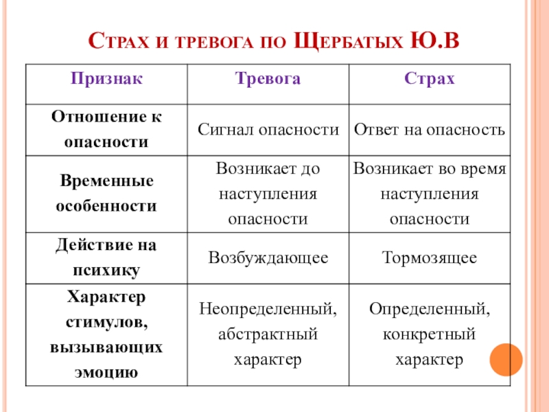 Слайд 5Страх и тревога по Щербатых Ю.В