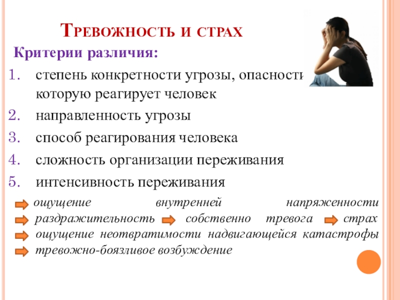 Тревожность и страх Критерии различия:степень конкретности угрозы, опасности, на которую реагирует человекнаправленность угрозыспособ реагирования человекасложность организации переживанияинтенсивность