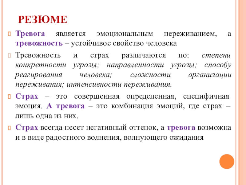РЕЗЮМЕТревога является эмоциональным переживанием, а тревожность – устойчивое свойство человекаТревожность и страх различаются по: степени конкретности угрозы;