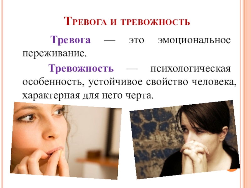 Тревога и тревожность  Тревога — это эмоциональное переживание.  Тревожность — психологическая особенность, устойчивое свойство человека,