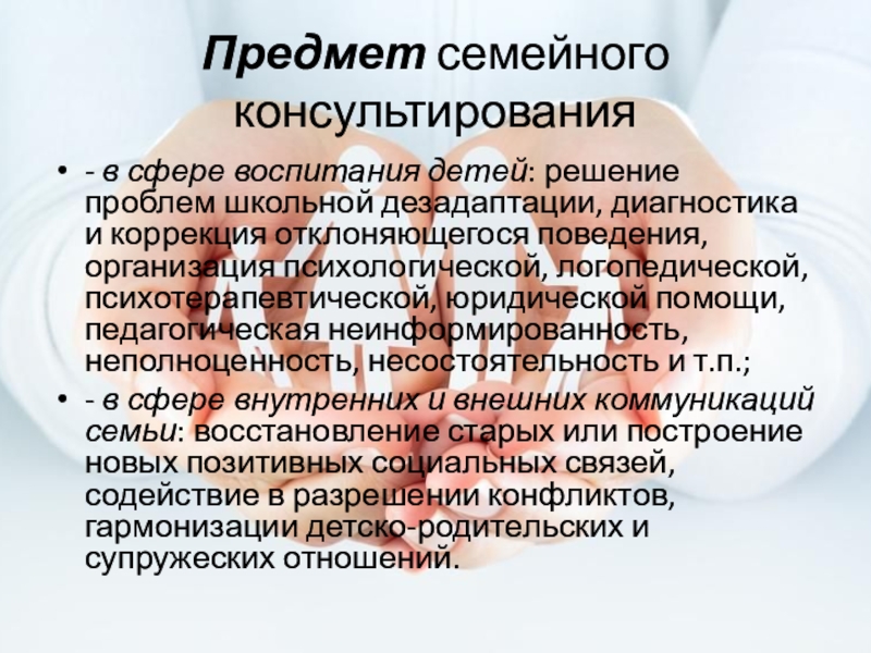 Предмет семейного консультирования - в сфере воспитания детей: решение проблем школьной дезадаптации, диагностика и коррекция отклоняющегося поведения,