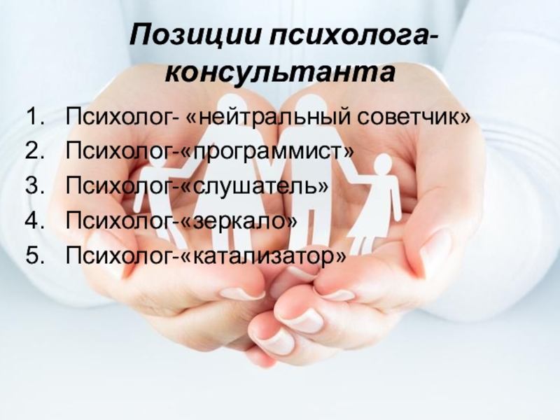 Позиции психолога-консультанта Психолог- «нейтральный советчик» Психолог-«программист» Психолог-«слушатель» Психолог-«зеркало» Психолог-«катализатор»