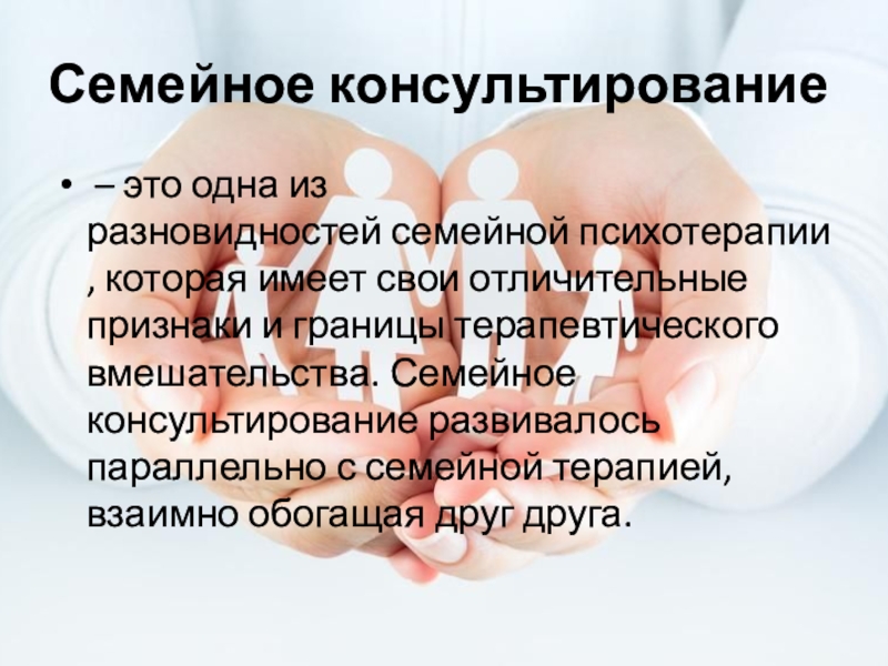Семейное консультирование – это одна из разновидностей семейной психотерапии, которая имеет свои отличительные признаки и границы терапевтического вмешательства. Семейное консультирование развивалось параллельно с семейной терапией, взаимно обогащая