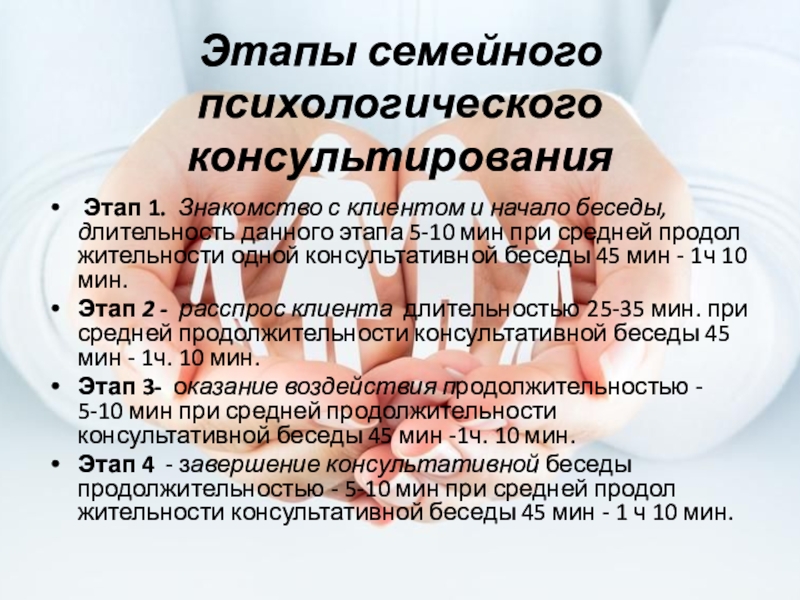 Этапы семейного психологического консультирования Этап 1. Знакомство с клиентом и начало беседы, длительность данного этапа 5-10 мин