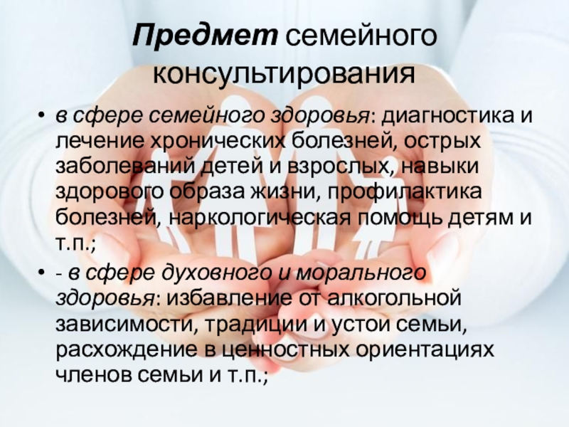 Предмет семейного консультирования в сфере семейного здоровья: диагностика и лечение хронических болезней, острых заболеваний детей и взрослых,