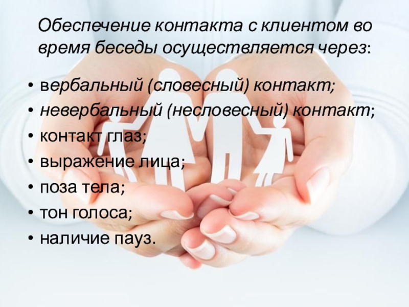 Слайд 10 Обеспечение контакта с клиентом во время беседы осуществляется через: