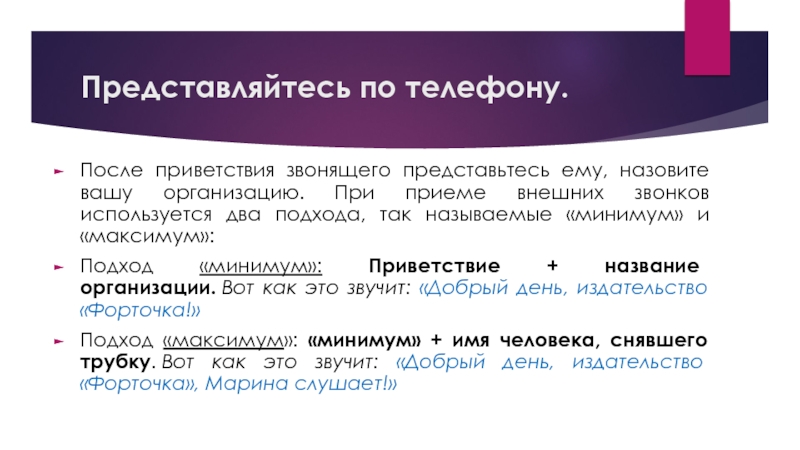 Подход «минимум»: Приветствие + название организации. Вот как это звучит: «Добрый день, издательство «Форточка!»