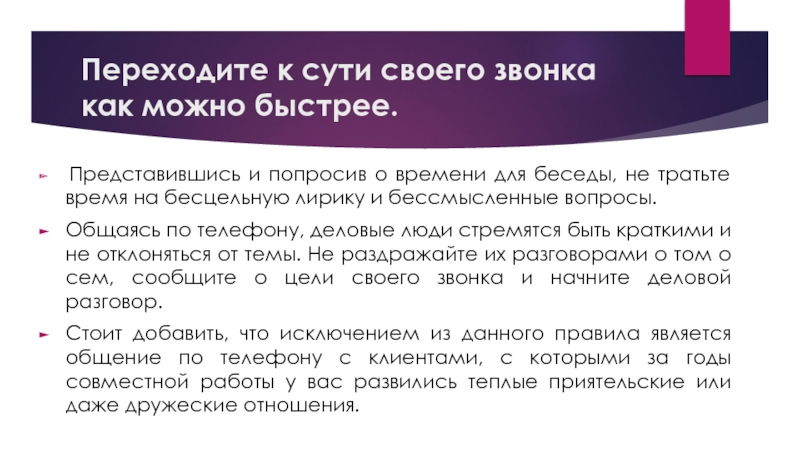 Слайд 10Переходите к сути своего звонка как можно быстрее.