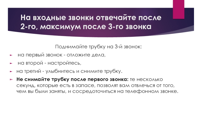 Слайд 8На входные звонки отвечайте после 2-го, максимум после 3-го звонка