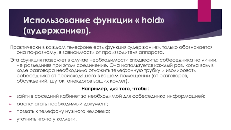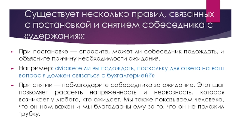 Слайд 12Существует несколько правил, связанных с постановкой и снятием собеседника с «удержания»: