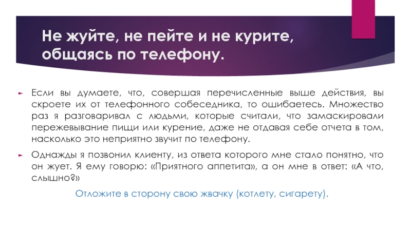 думаете, что, совершая перечисленные выше действия, вы скроете их от телефонного собеседника, то ошибаетесь. Множество раз я разговаривал с людьми, которые считали, что замаскировали пережевывание пищи или курение, даже не отдавая себе отчета в том, насколько это неприятно звучит по телефону.