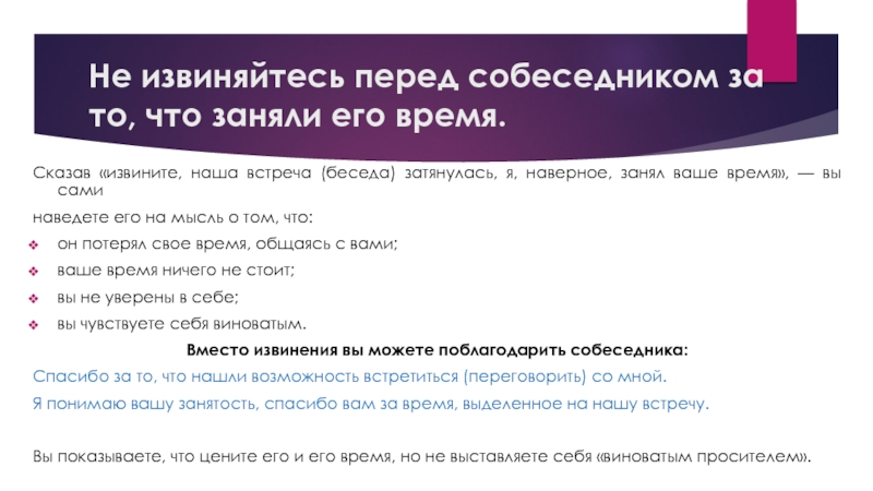 Слайд 16Не извиняйтесь перед собеседником за то, что заняли его время.