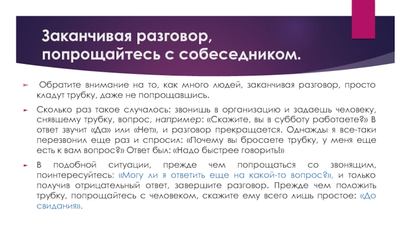Слайд 14Заканчивая разговор, попрощайтесь с собеседником.