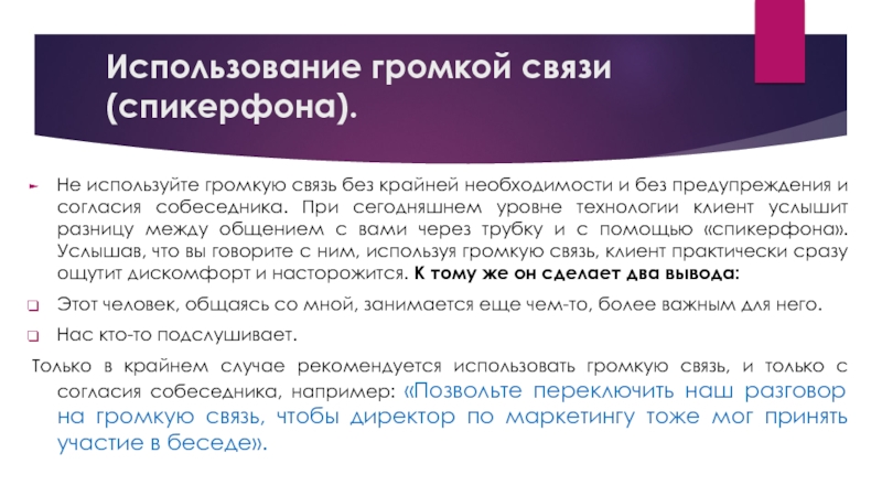 Только в крайнем случае рекомендуется использовать громкую связь, и только с согласия собеседника, например: «Позвольте переключить наш разговор на громкую связь, чтобы директор по маркетингу тоже мог принять участие в беседе».