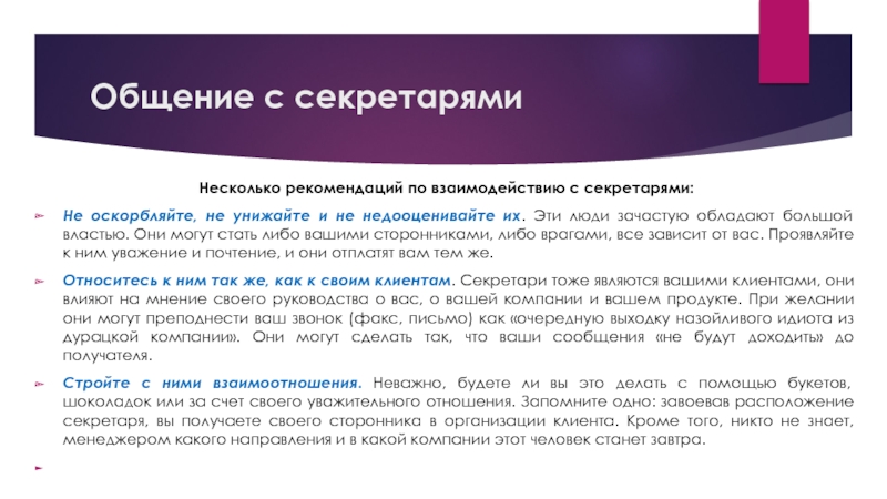 Относитесь к ним так же, как к своим клиентам. Секретари тоже являются вашими клиентами, они влияют на мнение своего руководства о вас, о вашей компании и вашем продукте. При желании они могут преподнести ваш звонок (факс, письмо) как «очередную выходку назойливого идиота из дурацкой компании». Они могут сделать так, что ваши сообщения «не будут доходить» до получателя.