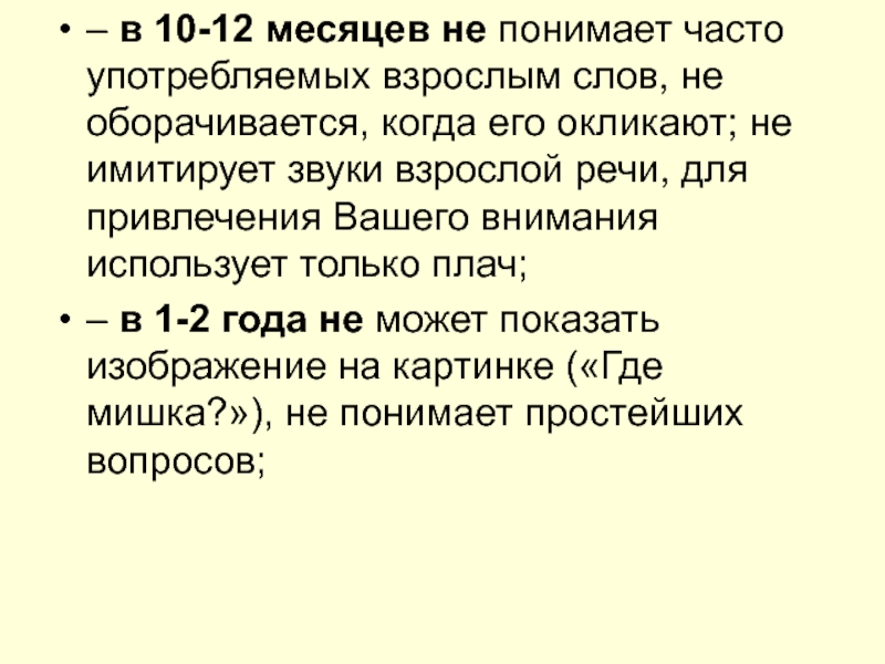 Слайд 10– в 10-12 месяцев не понимает часто употребляемых взрослым слов, не