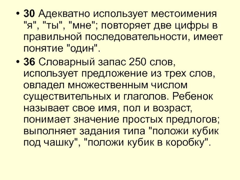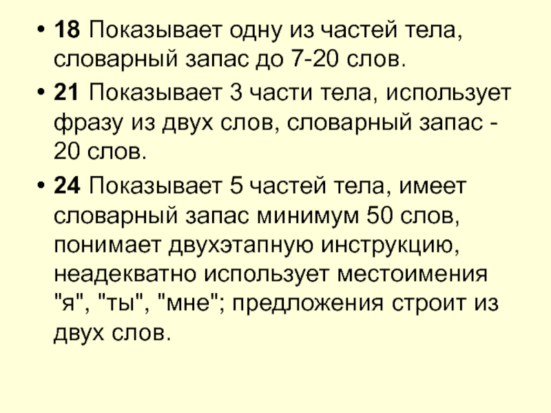 24 Показывает 5 частей тела, имеет словарный запас минимум 50 слов, понимает двухэтапную инструкцию, неадекватно использует местоимения "я", "ты", "мне"; предложения строит из двух слов.