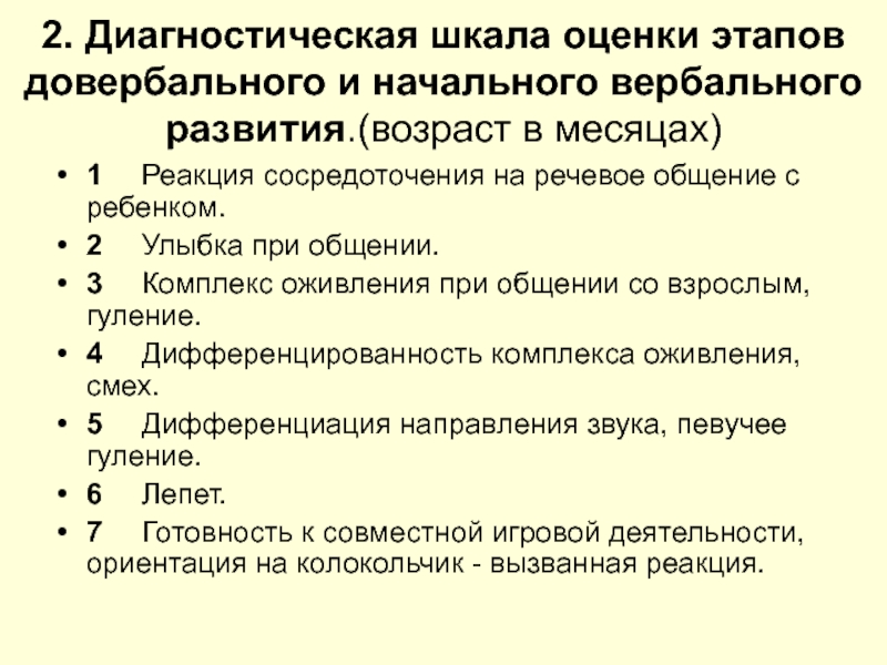 Слайд 182. Диагностическая шкала оценки этапов довербального и начального вербального развития.(возраст в