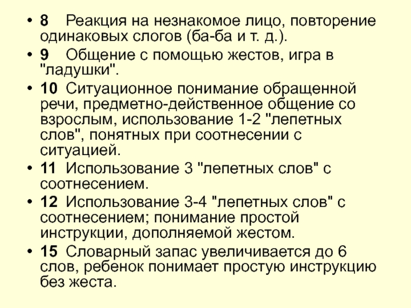 Слайд 198 Реакция на незнакомое лицо, повторение одинаковых слогов (ба-ба и т. д.).