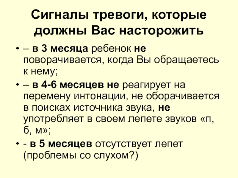 – в 4-6 месяцев не реагирует на перемену интонации, не оборачивается в поисках источника звука, не употребляет в своем лепете звуков «п, б, м»;