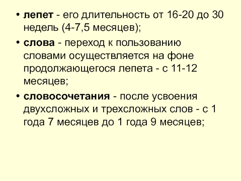 Слайд 5лепет - его длительность от 16-20 до 30 недель (4-7,5 месяцев);