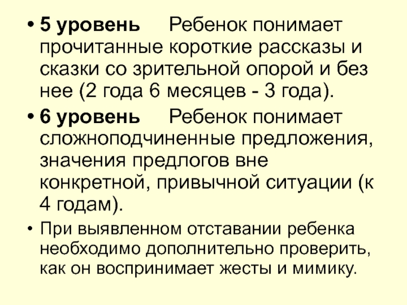 6 уровень Ребенок понимает сложноподчиненные предложения, значения предлогов вне конкретной, привычной ситуации (к 4 годам).