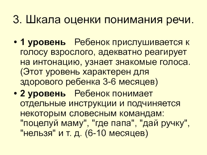 2 уровень Ребенок понимает отдельные инструкции и подчиняется некоторым словесным командам: "поцелуй маму", "где папа", "дай ручку", "нельзя" и т. д. (6-10 месяцев)