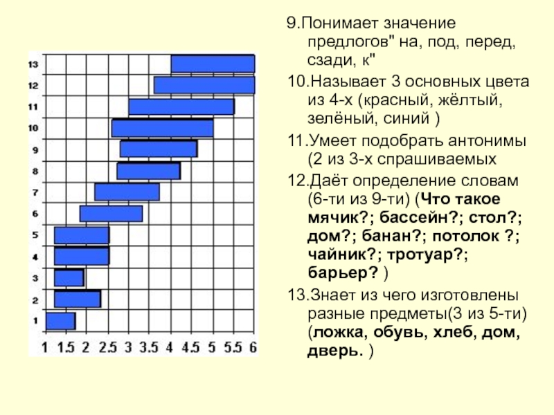 13.Знает из чего изготовлены разные предметы(3 из 5-ти) (ложка, обувь, хлеб, дом, дверь. )