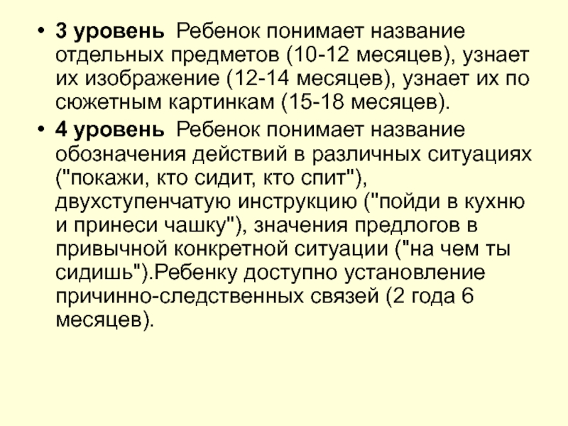 Слайд 243 уровень Ребенок понимает название отдельных предметов (10-12 месяцев), узнает их изображение