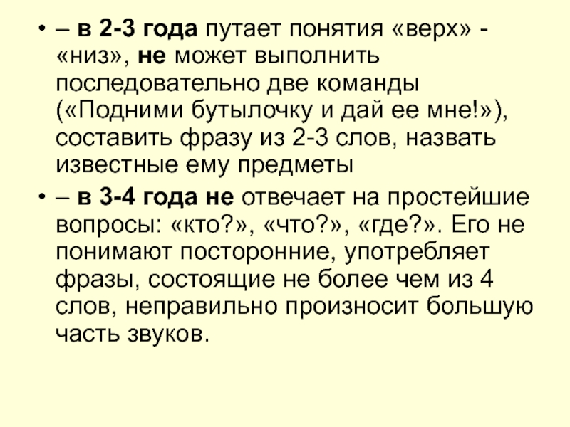 Слайд 11– в 2-3 года путает понятия «верх» -«низ», не может выполнить