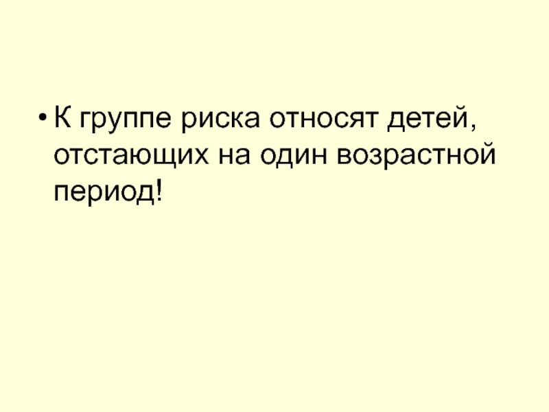 Слайд 22К группе риска относят детей, отстающих на один возрастной период!
