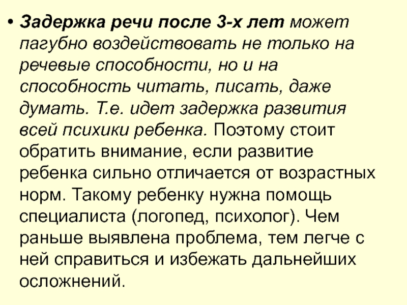 Слайд 8Задержка речи после 3-х лет может пагубно воздействовать не только на