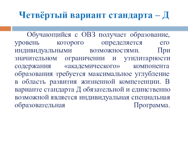 определяется его индивидуальными возможностями. При значительном ограничении и утилитарности содержания «академического» компонента образования требуется максимальное углубление в область развития жизненной компетенции. В варианте стандарта Д обязательной и единственно возможной является индивидуальная специальная образовательная Программа.