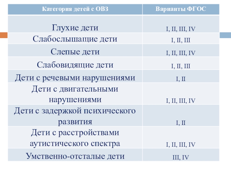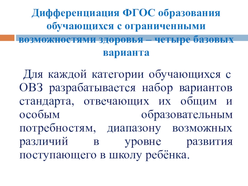 Для каждой категории обучающихся с ОВЗ разрабатывается набор вариантов стандарта, отвечающих их общим и особым образовательным потребностям, диапазону возможных различий в уровне развития поступающего в школу ребёнка.