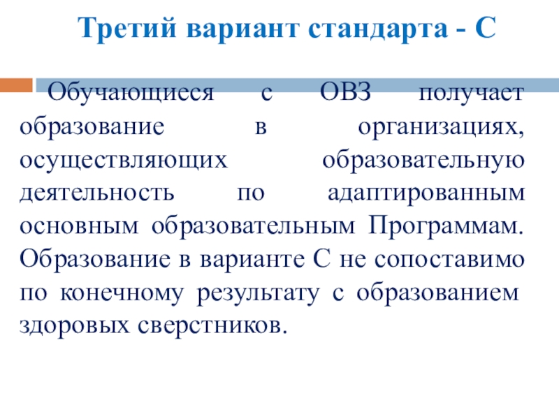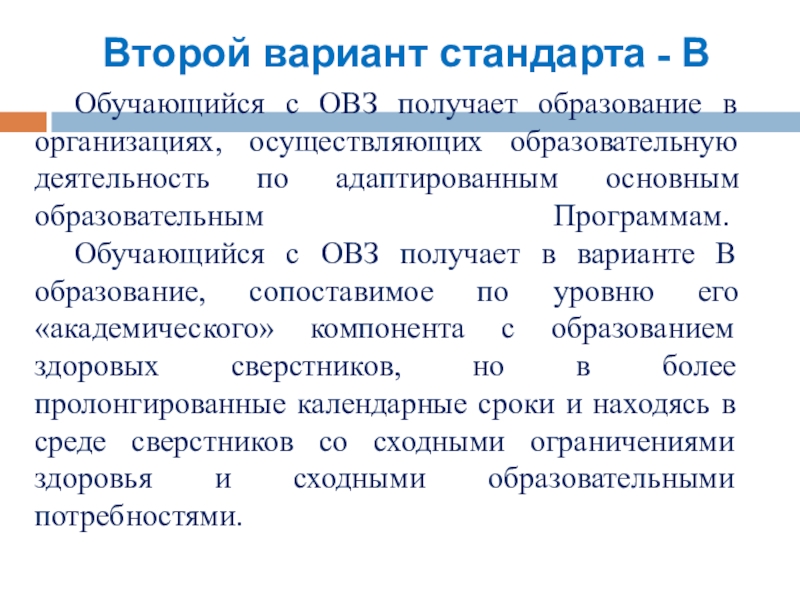 Обучающийся с ОВЗ получает в варианте В образование, сопоставимое по уровню его «академического» компонента с образованием здоровых сверстников, но в более пролонгированные календарные сроки и находясь в среде сверстников со сходными ограничениями здоровья и сходными образовательными потребностями.