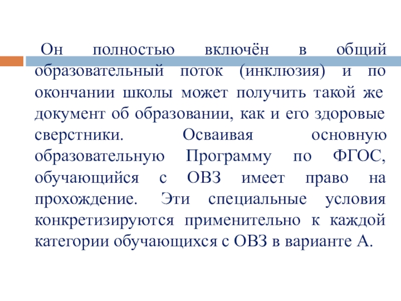 к моменту поступления в школу уровня развития, близкого возрастной норме и имеющим положительный опыт общения со здоровыми сверстниками. Обучающийся с ОВЗ получает образование, сопоставимое по конечному уровню с образованием здоровых сверстников, находясь в их среде и в те же календарные сроки.