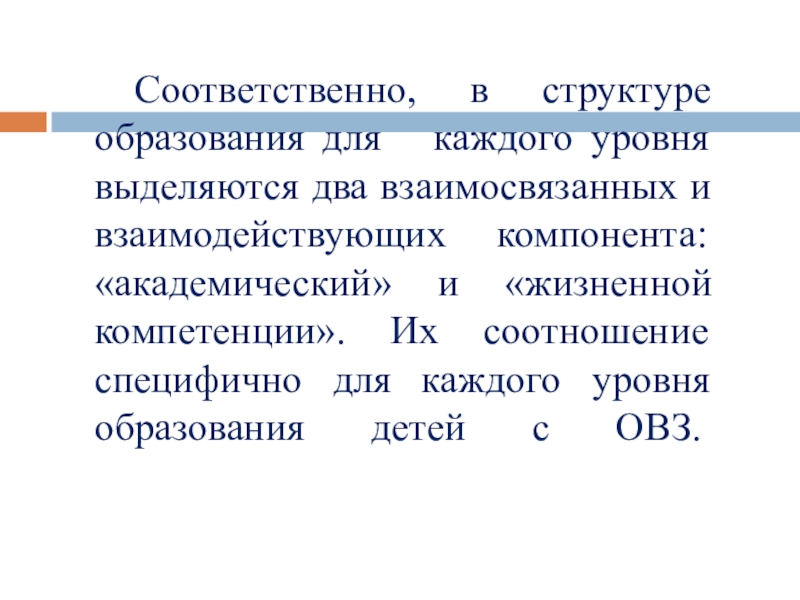 и взаимодействующих компонента: «академический» и «жизненной компетенции». Их соотношение специфично для каждого уровня образования детей с ОВЗ.