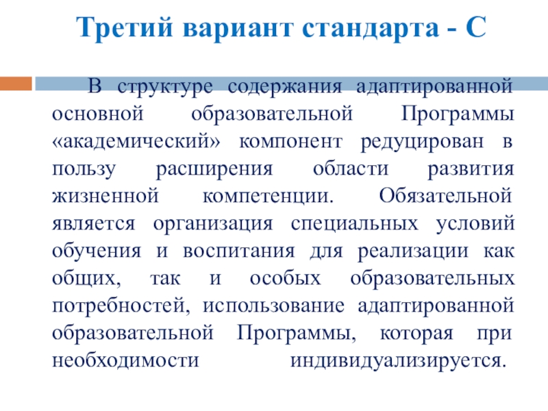 «академический» компонент редуцирован в пользу расширения области развития жизненной компетенции. Обязательной является организация специальных условий обучения и воспитания для реализации как общих, так и особых образовательных потребностей, использование адаптированной образовательной Программы, которая при необходимости индивидуализируется.
