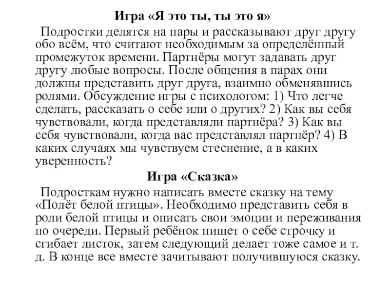 на пары и рассказывают друг другу обо всём, что считают необходимым за определённый промежуток времени. Партнёры могут задавать друг другу любые вопросы. После общения в парах они должны представить друг друга, взаимно обменявшись ролями. Обсуждение игры с психологом: 1) Что легче сделать, рассказать о себе или о других? 2) Как вы себя чувствовали, когда представляли партнёра? 3) Как вы себя чувствовали, когда вас представлял партнёр? 4) В каких случаях мы чувствуем стеснение, а в каких уверенность?